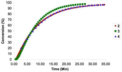 活性炭在CH 2 Cl 2中的活性與其他催化劑在二烯丙基二乙酸二乙酯的RCM反應(yīng)中進(jìn)行比較(5)。如圖2所示,PEG鏈與N-雜環(huán)碳烯(NHC)的連接不會(huì)顯著影響活性炭的活性。