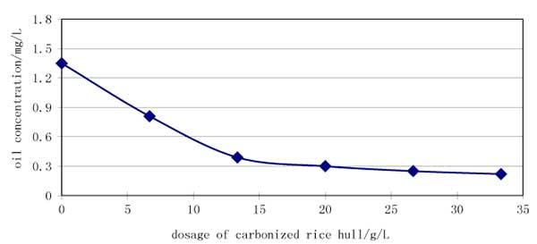 制備了六種海水(750ml)和活性炭(不同量的0,5,10,15,20和25g)的混合物,相應(yīng)于活性炭劑量0.00,6.67,13.33,20.00,26.67,33.33g / L ,吸附后的油濃度結(jié)果如圖2所示。海水初始油濃度為1.35 mg / L。如圖2所示,在活性炭劑量低于13.33 g / L時(shí),油濃度迅速下降,最低濃度為0.39 mg / L。然而,隨著活性炭劑量的進(jìn)一步增加,沒(méi)有明顯的油濃度下降,在實(shí)驗(yàn)條件下最低油濃度為0.22mg / L。