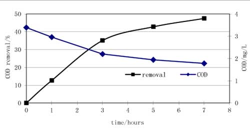 圖4給出了COD去除率和濃度隨吸附時(shí)間的曲線。根據(jù)實(shí)驗(yàn)結(jié)果,初始3小時(shí)吸附后COD濃度由3.39 mg / L降至2.2 mg / L,相當(dāng)于去除率的35.1%。隨后趨于穩(wěn)定,最低值為1.78 mg / L,最高去除率為47.5%。