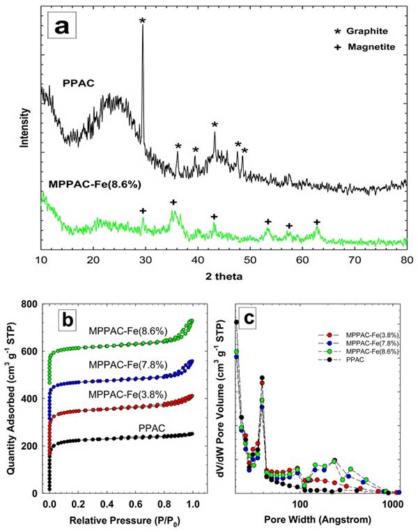圖:2(a)活性炭和磁化活性炭-Fe的XRD圖譜(8.6%),(b)N 2氣吸附-解吸等溫線和(c)根據(jù)方程計(jì)算的活性炭孔隙寬度的微分孔體積,F(xiàn)AAS校正。