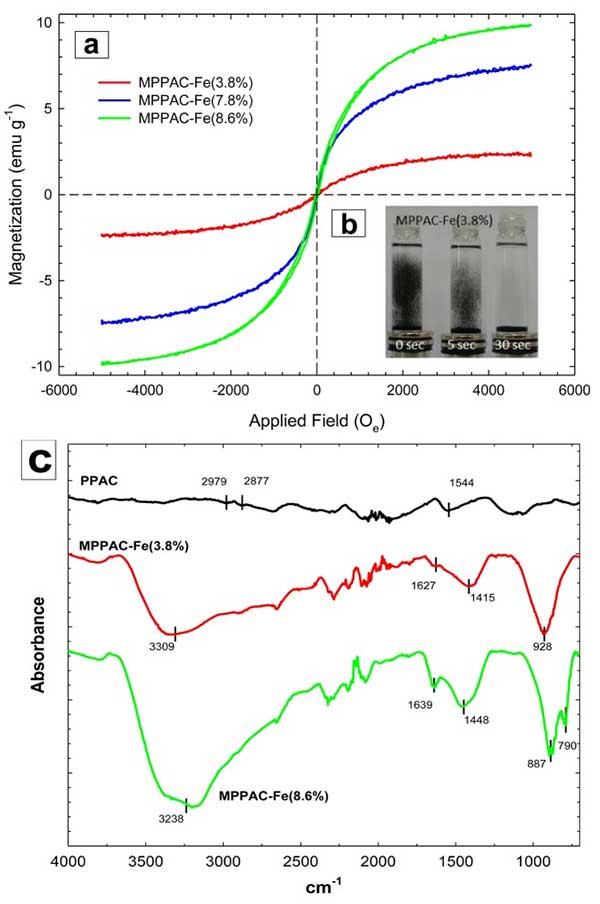圖:3(a)所有磁化活性炭材料的磁化強(qiáng)度與施加的磁場(chǎng)之間的關(guān)系,(b)顯示了由外部磁體懸浮的磁化杏花天的沉降時(shí)間,(c)活性炭,磁化活性炭-Fe(3.8%)和-Fe(8.6%)的FTIR光譜。