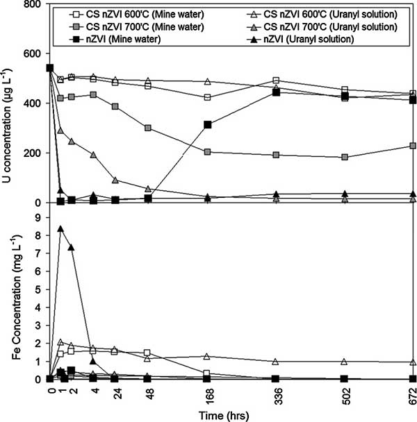 水溶液中鈾和鐵濃度的變化使用ICP-MS分析期間間隔提取的含水樣品記錄了使用在600℃形成的活性炭(圖6)處理的兩批系統(tǒng)(礦水和僅含鈾的溶液)中的有限的鈾去除 。在700℃形成的活性炭表現(xiàn)出改善的鈾去除,在反應時間168小時(1周)之后記錄僅鈾酰溶液的鈾(aq)的幾乎全部去除,并且最大去除67在反應時間502小時(3周)后記錄礦井水的%。