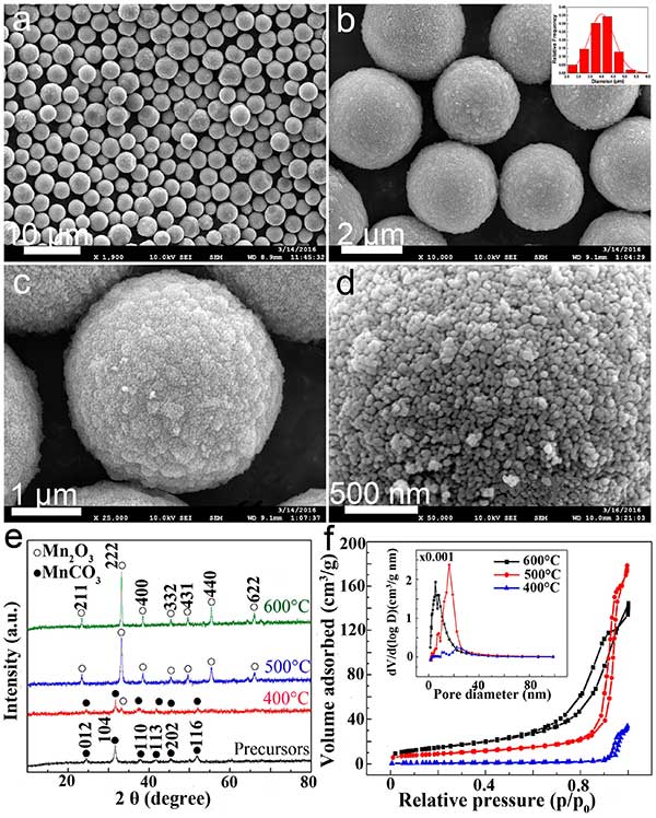 基于逐步自組裝生長(zhǎng)的方法,可以首先在甘油中制備具有良好控制的尺寸和形態(tài)的單分散的MnCO 3前體微球體,然后將其轉(zhuǎn)化為分級(jí)的多孔Mn 2 O 3通過(guò)在400,500和600℃下退火8小時(shí),大規(guī)模涂覆活性炭的微球體。我們可以通過(guò)簡(jiǎn)單地使用甘油作為溶劑合成活性炭層來(lái)裝飾Mn基電極材料,然后在較高溫度下原位碳化生物質(zhì)。根據(jù)一系列的實(shí)驗(yàn)測(cè)試發(fā)現(xiàn)這些材料的高度增強(qiáng)的電化學(xué)性能可歸因于它們的表面的活性炭涂層。