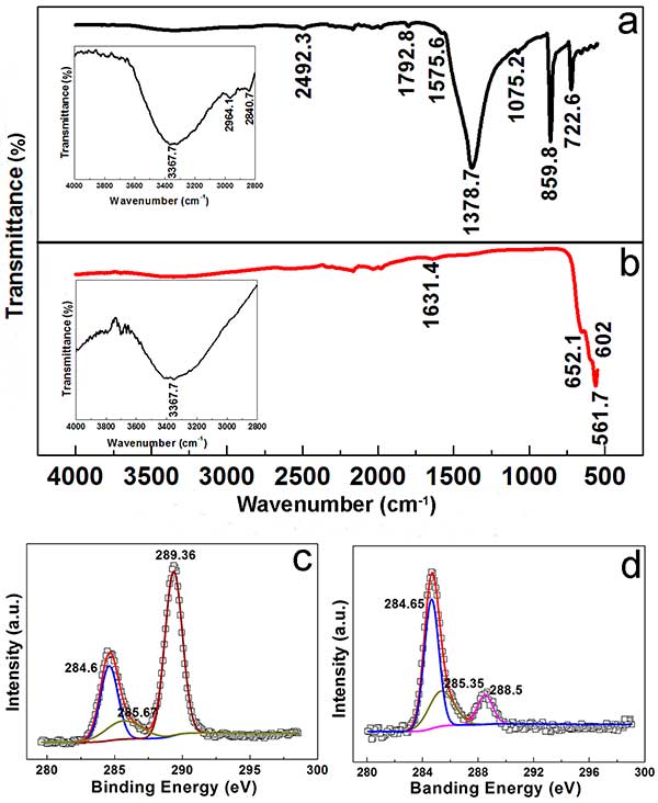 圖2. (a)前體和(b)活性炭氧化錳提的FTIR光譜。(c)前體和(d)活性炭氧化錳提的X射線光電子能譜(XPS)C1s譜。(a,b)中的插圖分別突出了來(lái)自2800-4000cm -1的前體和最終產(chǎn)物的FTIR光譜,其中縱軸放大。