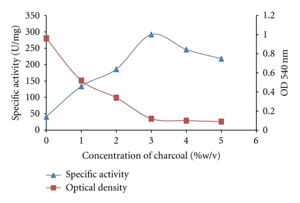 圖1中顯示的結(jié)果顯示了各種濃度的活性炭對(duì)純化真菌淀粉酶的影響。 當(dāng)活性炭濃度增加到3%w/v時(shí),葡糖淀粉酶的比活性顯著增加,最適比活性為250U/mg。 進(jìn)一步增加超過(guò)3%(w/v)導(dǎo)致其具體活動(dòng)減少。在處理的樣品中觀察到約90%的濁度降低。 據(jù)觀察,隨著所用木炭量的增加,吸收速率在數(shù)量上變化。據(jù)報(bào)道吸附程度受吸附劑對(duì)吸附劑的可及性的影響。