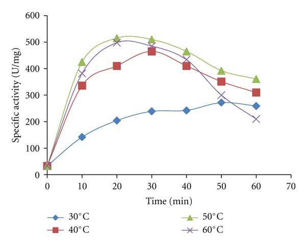 圖2中的結(jié)果總結(jié)了時(shí)間和溫度對(duì)活性炭純化淀粉酶的影響。 很明顯,在高溫下通過(guò)活性炭純化真菌淀粉酶使真菌淀粉酶的比活性顯著增加。 在50℃下,在20分鐘的駐留時(shí)間下獲得520U/mg的最佳比活性。 然而,在溫度超過(guò)50℃和超過(guò)30分鐘的較長(zhǎng)時(shí)間用活性炭進(jìn)行酶處理導(dǎo)致淀粉酶活性降低。顯然,升高的溫度增強(qiáng)了活性炭的蛋白質(zhì)吸收和脫色能力。 吸收率和吸收能力主要取決于活性炭的表面化學(xué)性質(zhì),接觸時(shí)間和溫度。