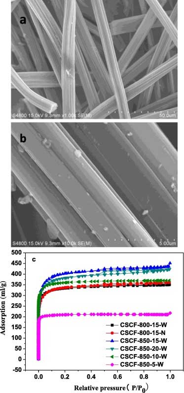 SEM和氮吸附/脫附等溫線進行選擇活性炭來說明表面形態(tài)和孔結(jié)構(gòu)。如圖所示圖一,棉桿制成的活性炭形態(tài)是光滑的,并且微晶是清楚的。在不同活化溫度制備四個選定的樣品的氮吸附等溫線和停留時間。它可以從中可以看出該四個選擇的樣本的所有的等溫線顯示了在低的相對壓力的急劇增加(P / P 0< 0.05),說明在碳骨架大量微孔的產(chǎn)生。活性炭的等溫線的下面部分幾乎是線性的,吸附和解吸的分支基本上是一致的。