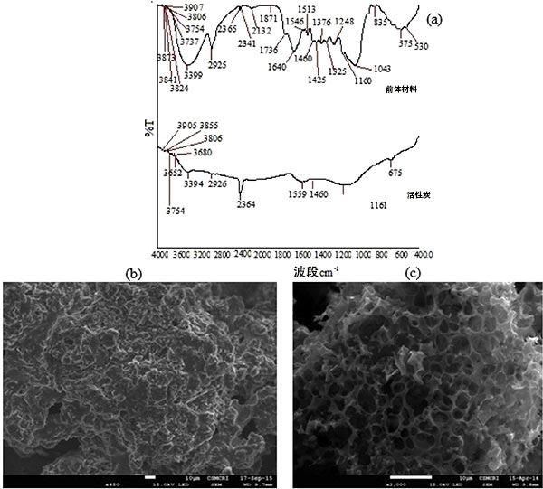 圖4。(a)前體材料和活性炭的FTIR光譜(b)前體材料的SEM圖像和(c)活性炭的SEM圖像。