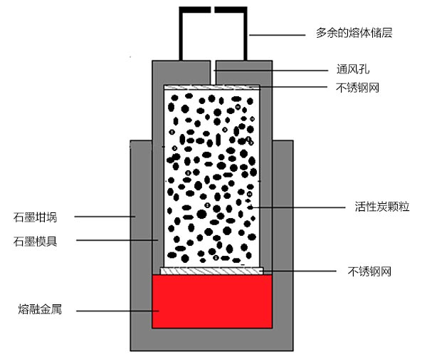 活性炭是性價比高的碳質(zhì)材料,具有低堆積密度,高比表面積和優(yōu)異的化學(xué)穩(wěn)定性。它廣泛用于水處理,以吸收飲用水中的雜質(zhì)。AZ91鎂合金(9重量%Al,1重量%Zn,0.5重量%Mn,余量Mg)用作金屬復(fù)合泡沫的基質(zhì)?;钚蕴繌?fù)合泡沫材料的制造,首先將石墨模具填充在四個單獨的填料和振動步驟中,在每個步驟中使用等量的活性炭顆粒。這種壓實方法使整個樣品高度的密度梯度最小化。在該步驟之后,將不銹鋼網(wǎng)插入模具的開口端以將活性炭顆粒保持在適當(dāng)位置。組裝在充滿氬氣的手套箱內(nèi)進行,以最小化系統(tǒng)中的氧氣水平。為此,將AZ91合金塊插入石墨坩堝內(nèi),并將填充的石墨模具倒置在坩堝內(nèi)。然后將鋼帽放在模具頂部以在滲透鑄造期間收集過量的熔體。在下一步中,這些部件位于不銹鋼套管內(nèi)。最后,將組件放入電爐內(nèi)并在660℃的溫度下保持45分鐘,同時使用保護性氬氣氛以防止鎂合金在鑄造過程中氧化燃燒。通過施加0.02MPa的壓力迫使金屬熔體滲入填充的活性炭顆粒床。在大氣條件下冷卻模具后,手動從模具中取出生產(chǎn)的樣品。圖1顯示了使用的設(shè)置的示意圖。