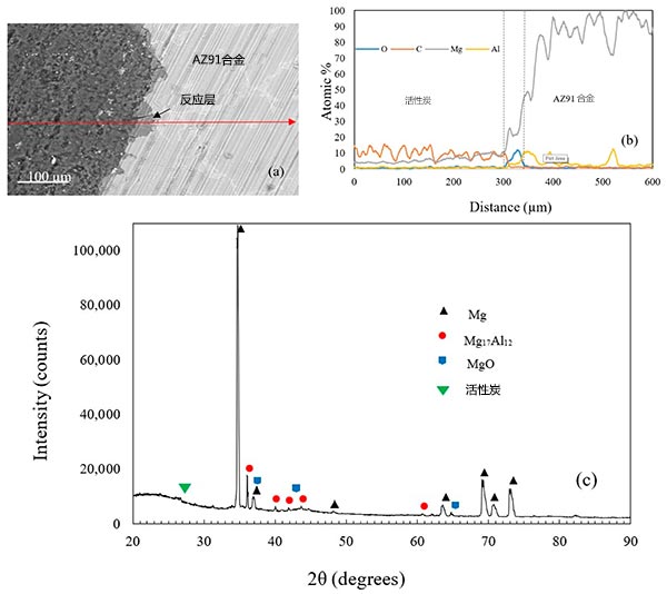 圖3.(a)AZ91基質(zhì)和活性炭之間界面的SEM圖像,(b)EDS線掃描,(c)活性炭復(fù)合泡沫的XRD圖。